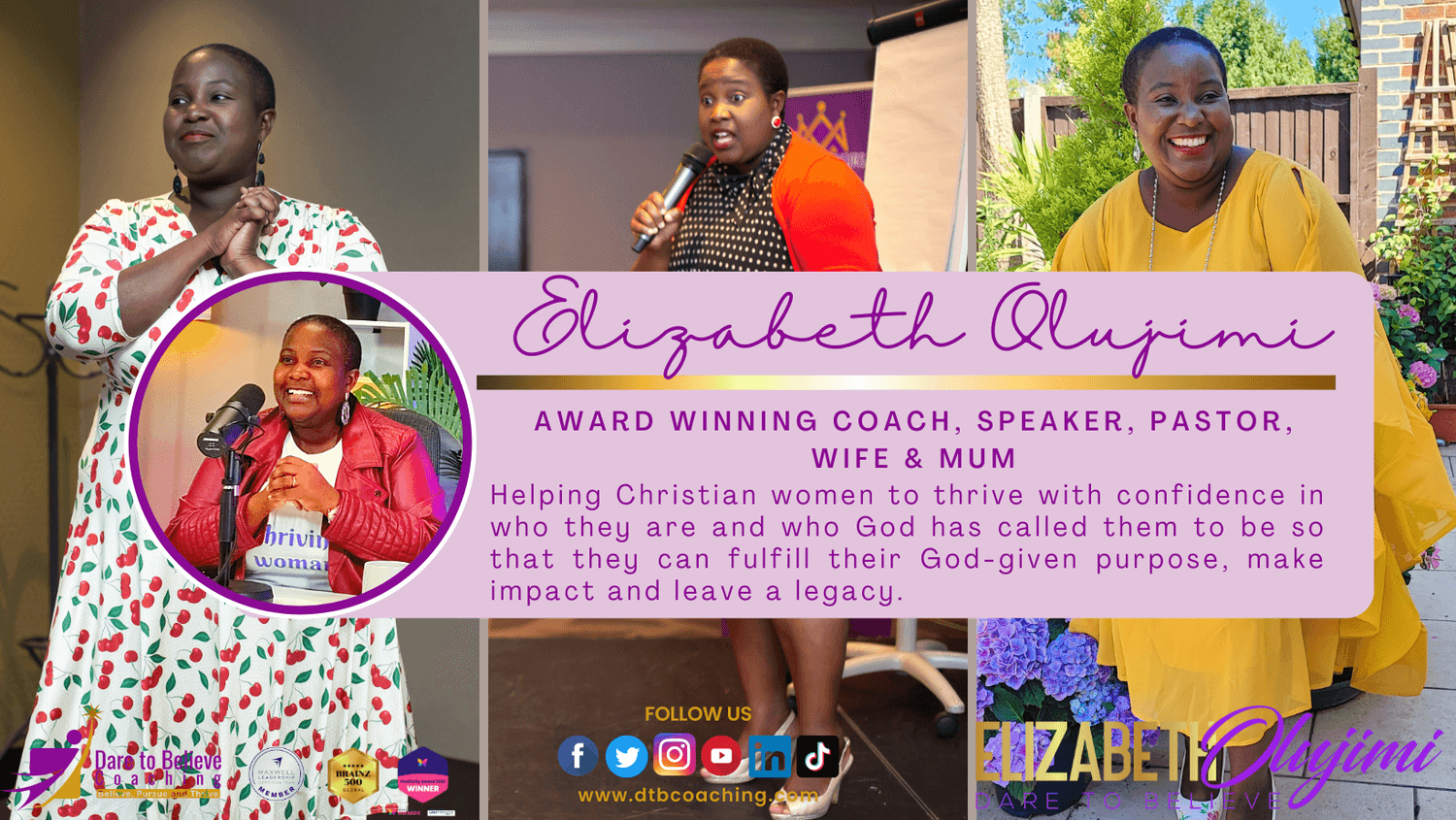 Elizabeth Olujimi, known as the Thriving Coach, is a wife, mother, pastor, coach, international speaker and mentor dedicated to helping Christian women thrive with confidence in who they are and who God has called them to be. As the CEO of Dare to Believe Coaching Ltd, Elizabeth is passionate about guiding women to pursue their God-given purpose, make impact and leave a lasting legacy